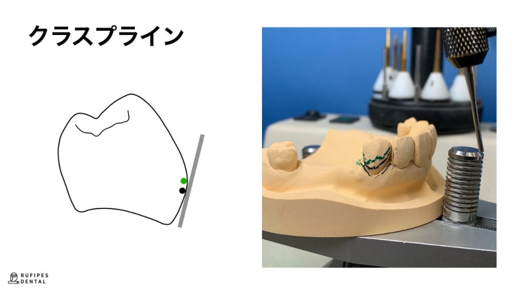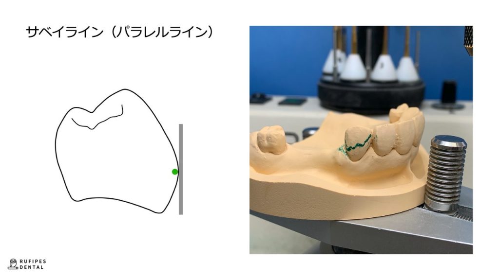 着脱方向に対し角度を付けてサベイラインの下に引かれる黒のラインで、そのままクラスプの設計線として使うことができる。